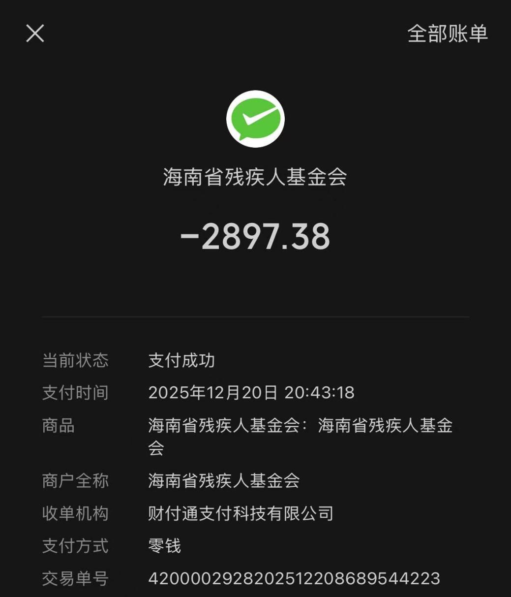 本次活动中,共有116人次参与,累计募集善款2897.38元。这份沉甸甸的爱心,已统一转交至海南省残疾人基金会。每一笔善款,无论金额大小,都承载着大家对残疾人群体的深切关怀;每一份参与,都为残疾人事业的发展注入了温暖力量。尤为可贵的是,孩子们在此过程中,亲身体会到了关爱他人、奉献爱心的意义,这不仅是一次公益实践,更是一堂生动的德育课程,让善良与担当的种子在孩子们心中生根发芽。