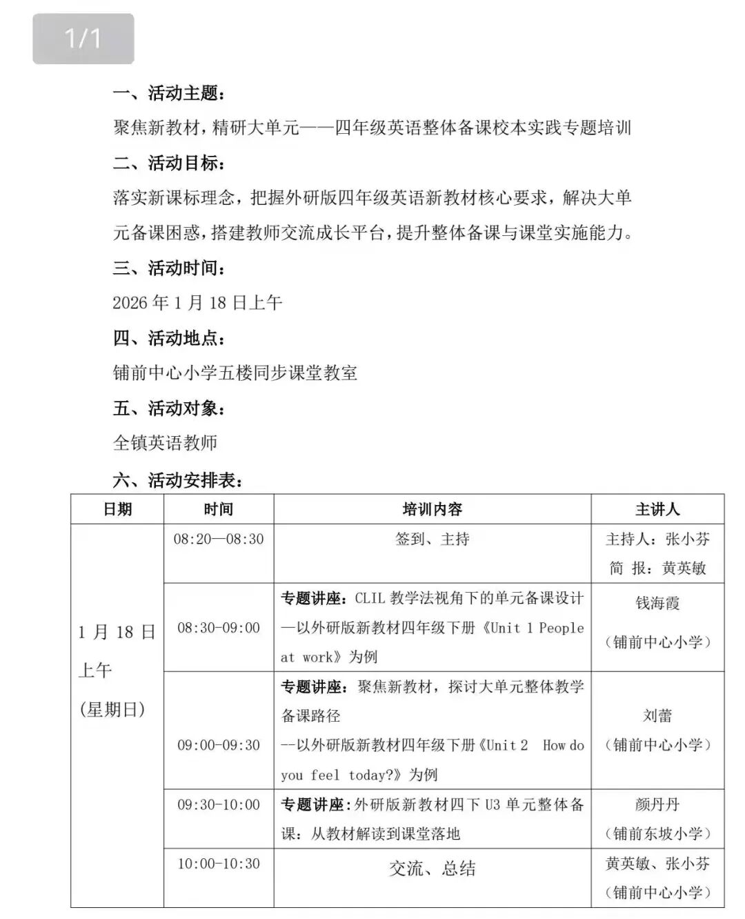 最后,张小芬组长对本次活动进行了总结。她指出:三位老师的分享各有侧重,理论结合实践,为新教材教学打响了“第一枪”。本次培训构建了前三个单元的完整教学认知,更传递了互助共进的教研精神。希望大家以此为契机,持续深耕单元整体备课,大胆实践、资源共享,让新教材的价值在课堂中充分彰显,切实提升学生核心素养。