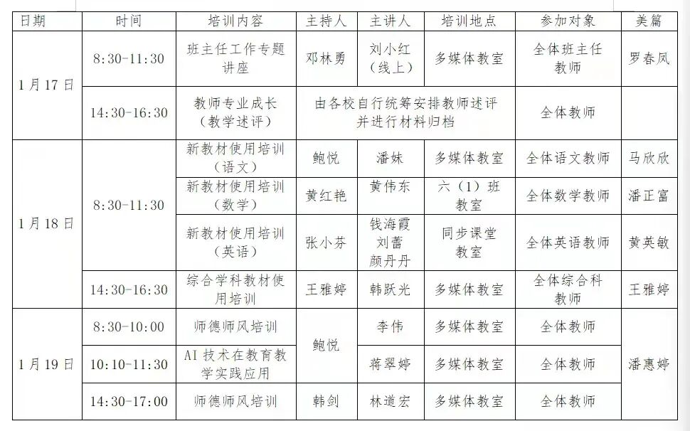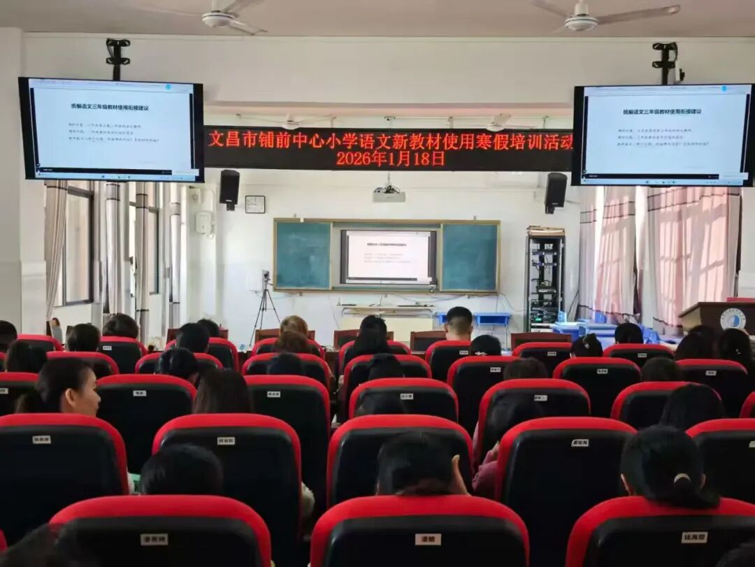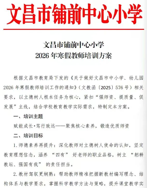 为深入贯彻文昌市教育局《关于做好文昌市中小学、幼儿园2026年寒假教师培训工作的通知》要求,紧扣“赋能成长・笃行致远——聚焦核心素养,锻造优质师资”主题,文昌市铺前中心小学于2026年1月17日-19日开展为期3天的寒假教师培训活动,全体教职员工全员参与。