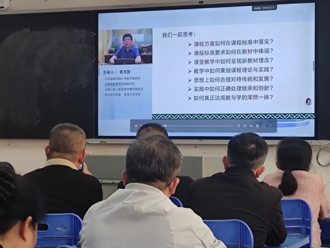专家引领,素养提升。全体教师共同观看管尤跃专家的视频讲座《核心素养导向下的小学数学教学建议》。讲座围绕小学数学核心素养的内涵与落地路径展开,结合具体课例阐述了如何在课堂教学中培养学生的数学思维与关键能力,为教师们践行素养导向的教学提供了专业的理论支撑与实践范例。