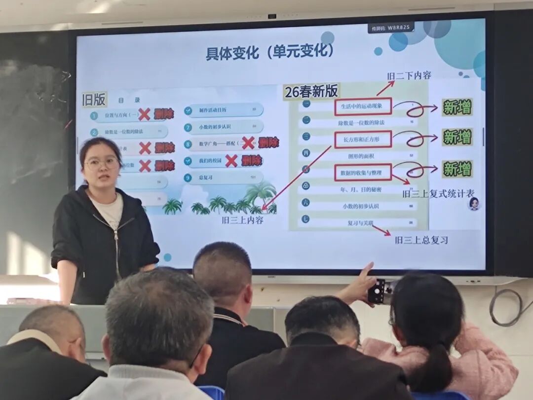 铺前中心小学的徐丽娜老师聚焦三年级上册新教材,从新旧教材对比、新教材分析、本册重难点知识三个方面进行深度解读。徐老师通过对比新旧教材的知识点编排,剖析了新教材的设计思路与育人价值,重点讲解了本册教材中“数与代数”“图形与几何”等板块的难点内容,并结合教学案例分享了突破重难点的实用方法。